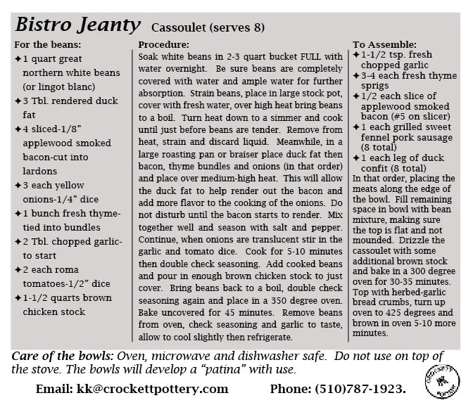 These are used at Bistro Jeanty. My cassoulet bowls are made from a sturdy red clay and are glazed on the inside with a food safe glaze. They can be used in a hot oven up to 400 degrees, and are microwave and dishwasher safe. Do not use on a stovetop; direct heat from one direction may cause breakage. At Bistro Jeanty and the Ledford House the pre-cooked beans and other ingredients are assembled in individual cassoulet bowls, baked until the top is brown and bubbly, then taken directly to the table. As in all of my work, cassoulet bowls are made one at a time by hand, and small variations occur.
